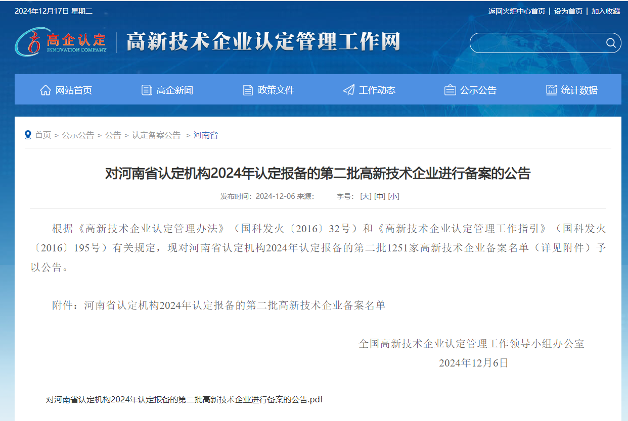 2024年12月6日,全国高新技术企业认定管理工作领导小组办公室发布《对河南省认定机构2024年认定报备的第二批高新技术企业进行备案的公告》,根据《高新技术企业认定管理办法》(国科发火(2016)32号)和《高新技术企业认定管理工作指引》(国科发火(2016)195号)有关规定,对河南省认定机构2024年认定报备的第二批1251家高新技术企业备案名单予以公告,我司赫然在列。