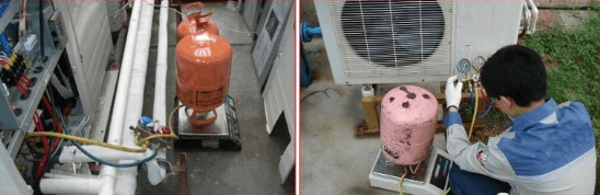 外机安装完毕后在充填冷媒前需要对冷媒管进行抽真空,把管内的空气抽出,保持管内干燥、无水分,否则空气和水会与冷媒混合产生冰晶,严重的会造成设备损坏。